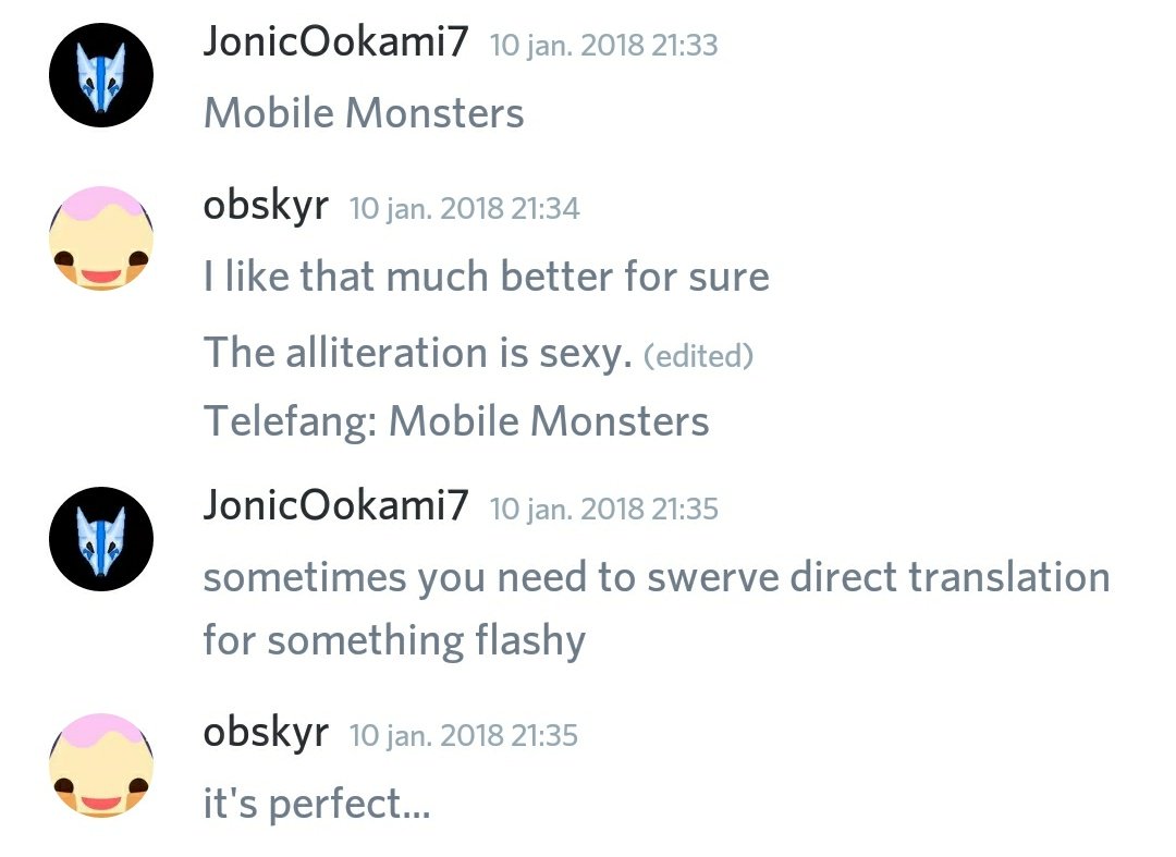 - As suggested by JonicOokami7, we decided to change the tagline for the English translation to Telefang: Mobile Monsters. (Thanks, obskyr and andwhyisit!)